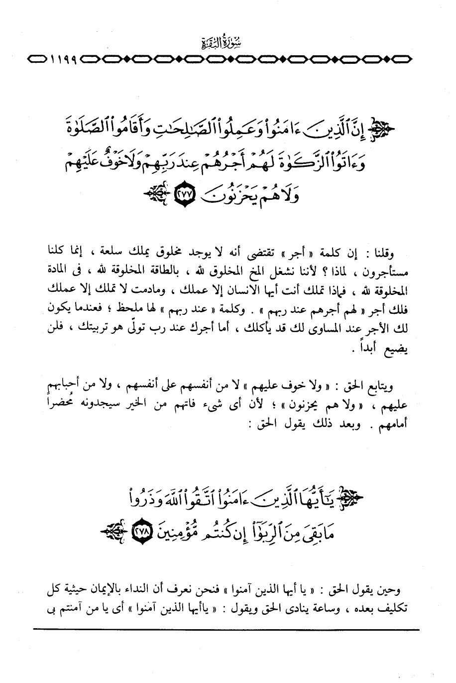 وقلنا: إن كلمة «أجر» تقتضي أنه لا يوجد مخلوق يملك سلعة، إنما كلنا مستأجرون، لماذا؟ لأننا نشغل المخ المخلوق لله، بالطاقة المخلوقة لله، في المادة المخلوقة لله، فماذا تملك أنت أيها الإنسان إلا عملك، وما دمت لا تملك إلا عملك فلك أجر {لَهُمْ أَجْرُهُمْ عِندَ رَبِّهِمْ} . وكلمة {عِندَ رَبِّهِمْ} لها ملحظ؛ فعندما يكون لك الأجر عند المساوي لك قد يأكلك، أما أجرك عند رب تولّى هو تربيتك، فلن يضيع أبداً.