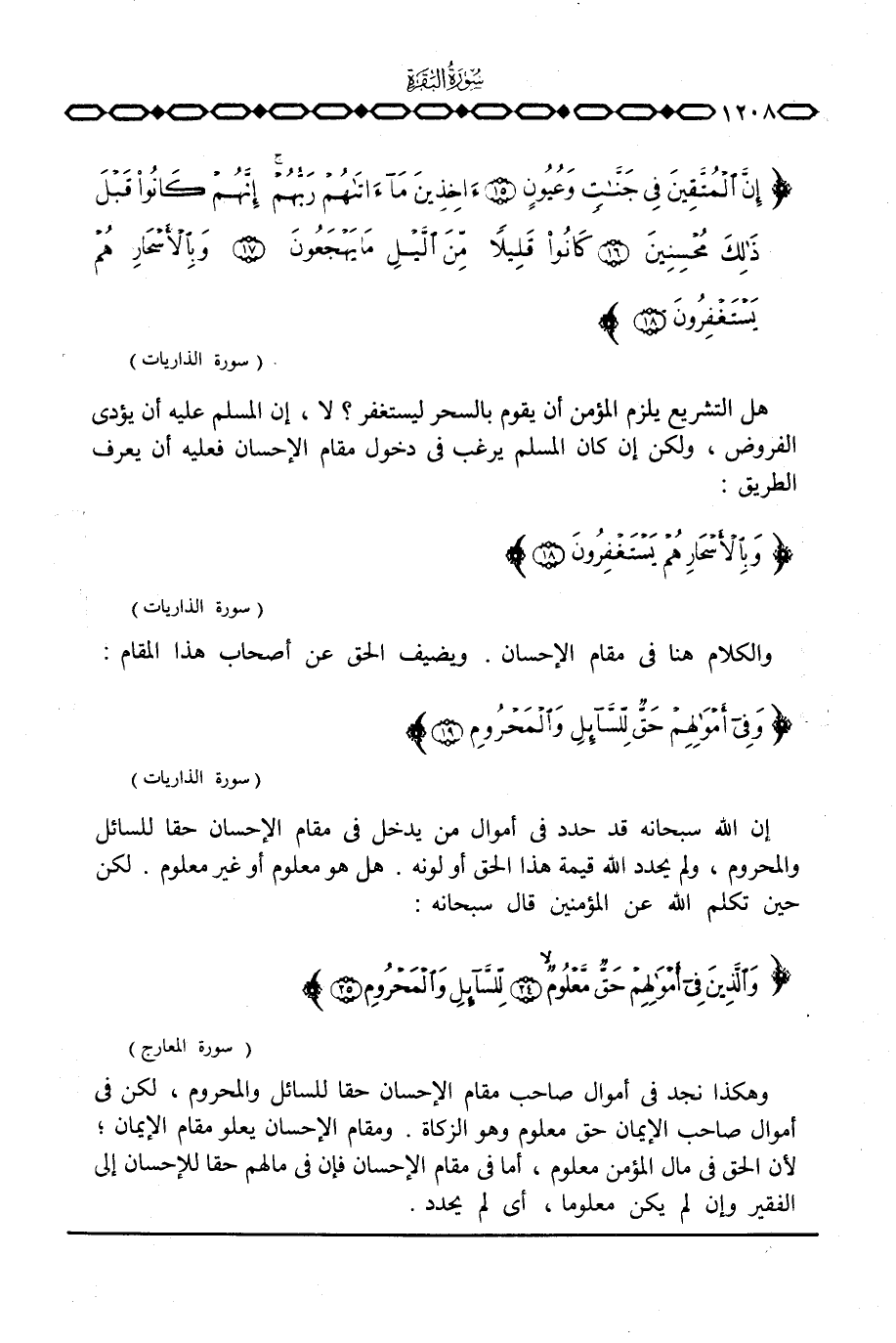 وهكذا نجد في أموال صاحب مقام الإحسان حقا للسائل والمحروم، لكن في أموال صاحب الإيمان حق معلوم وهو الزكاة. ومقام الإحسان يعلو مقام الإيمان؛ لأن الحق في مال المؤمن معلوم، أما في مقام الإحسان فإن في مالهم حقا للإحسان إلى الفقير وإن لم يكن معلوما، أي لم يحدد.