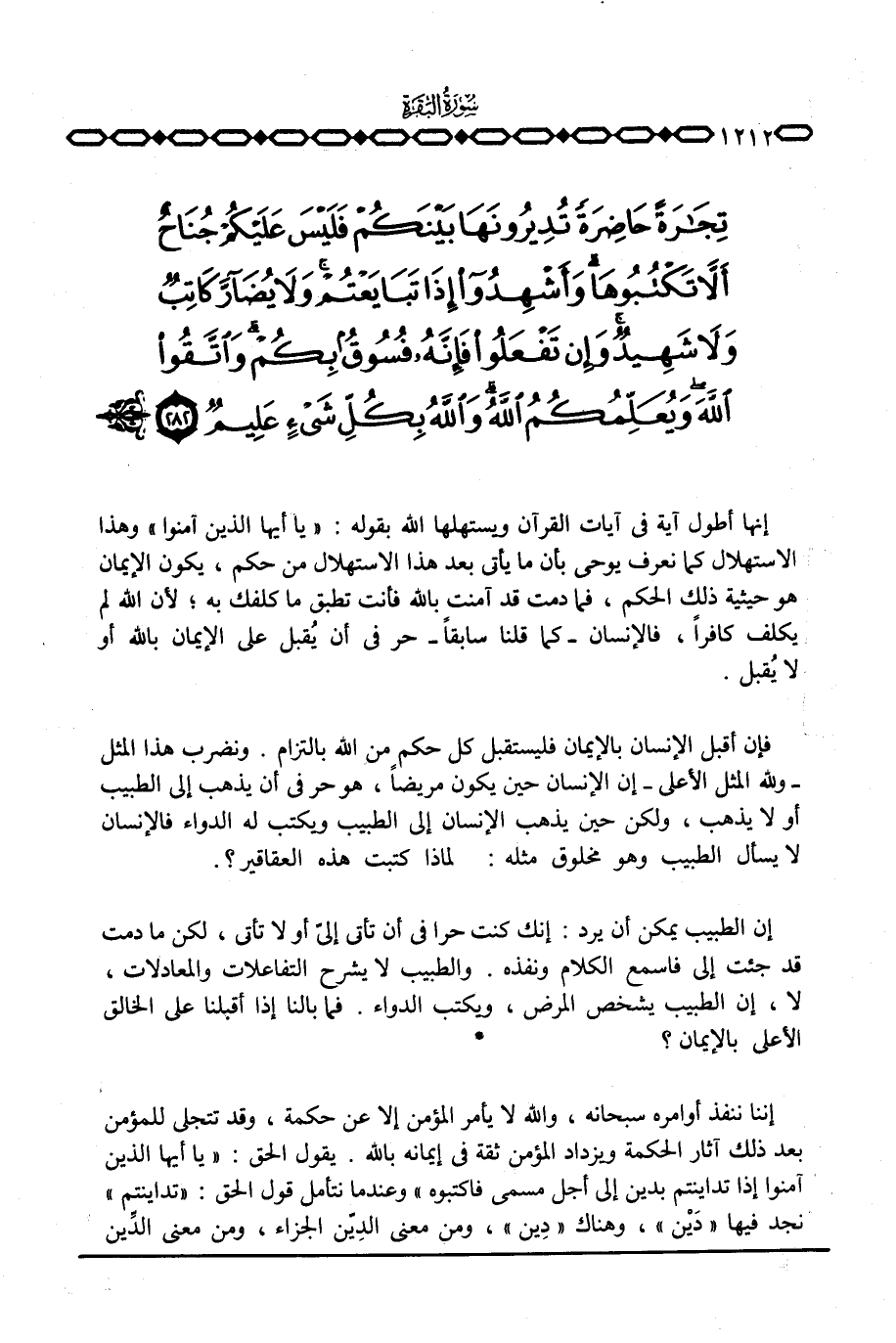 فإن أقبل الإنسان بالإيمان فليستقبل كل حكم ن الله بالتزام. ونضرب هذا المثل ولله المثل الأعلى إن الإنسان حين يكون مريضاً، هو حر في أن يذهب إلى الطبيب أو لا يذهب، ولكن حين يذهب الإنسان إلى الطبيب ويكتب له الدواء فالإنسان لا يسأل الطبيب وهو مخلوق مثله: لماذا كتبت هذه العقاقير؟ .