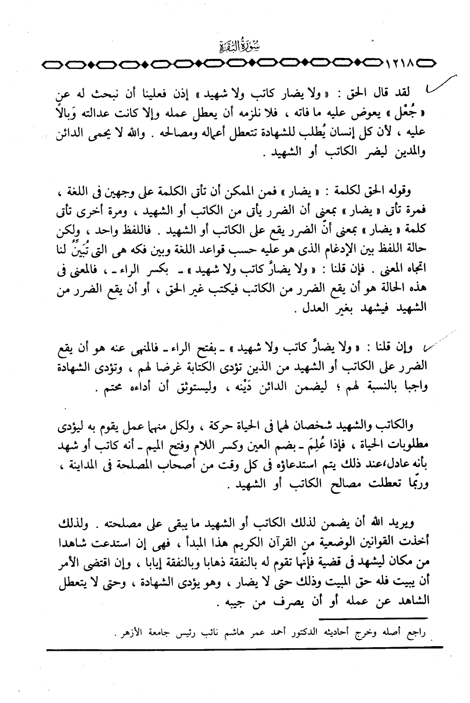 ويريد الله أن يضمن لذلك الكاتب أو الشهيد ما يبقى على مصلحته. ولذلك أخذت القوانين الوضعية من القرآن الكريم هذا المبدأ، فهي إن استدعت شاهدا من مكان ليشهد في قضية فإنّها تقوم له بالنفقة ذهابا وبالنفقة إيابا، وإن اقتضى الأمر أن يبيت فله حق المبيت وذلك حتى لا يضار، وهو يؤدي الشهادة، وحتى لا يتعطل الشاهد عن عمله أو يصرف من جيبه.