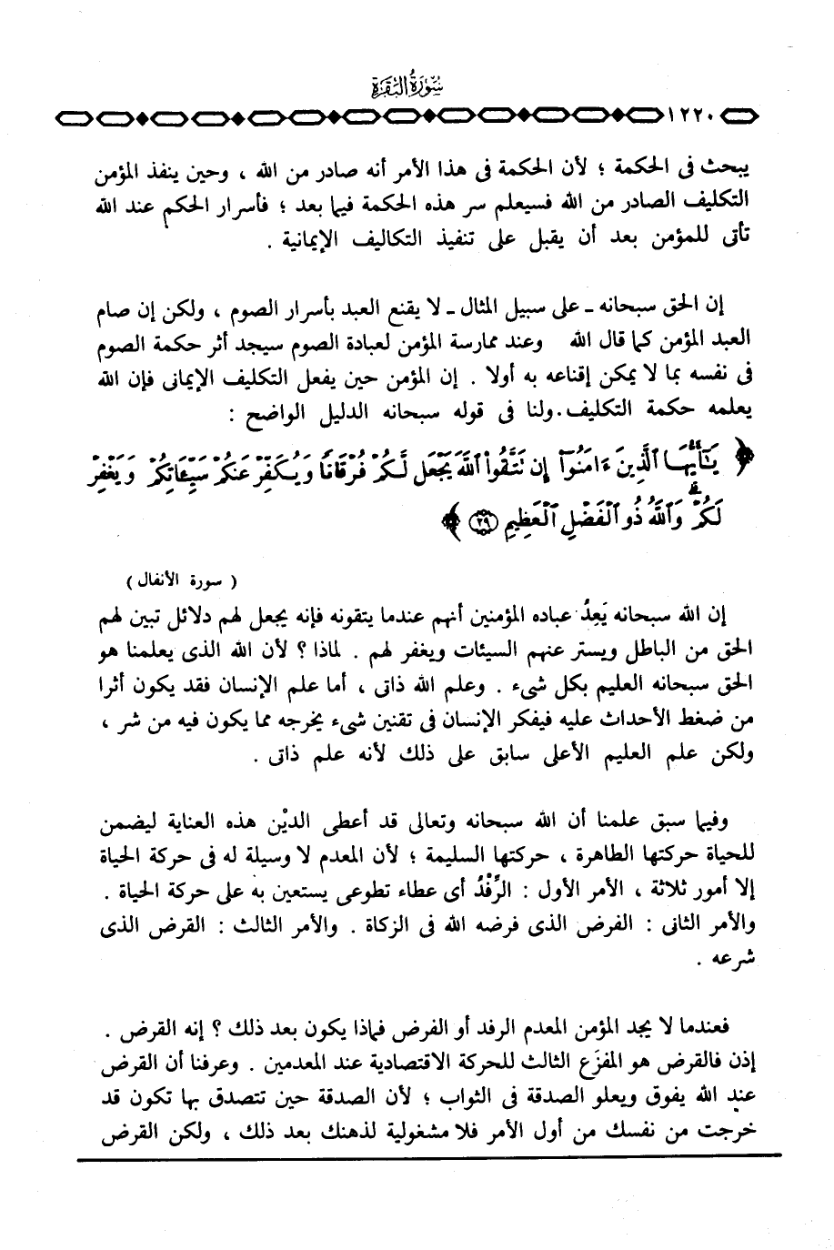 إن الحق سبحانه على سبيل المثال لا يقنع العبد بأسرار الصوم، ولكن إن صام العبد المؤمن كما قال الله وعند ممارسة المؤمن لعبادة الصوم سيجد أثر حكمة الصوم في نفسه بما لا يمكن إقناعه به أولا. إن المؤمن حين يفعل التكليف الإيماني فإن الله يعلمه حكمة التكليف. ولنا في قوله سبحانه الدليل الواضح: {يِا أَيُّهَا الذين آمنوا إِن تَتَّقُواْ الله يَجْعَل لَّكُمْ فُرْقَاناً وَيُكَفِّرْ عَنكُمْ سَيِّئَاتِكُمْ وَيَغْفِرْ لَكُمْ والله ذُو الفضل العظيم} [الأنفال: 29]