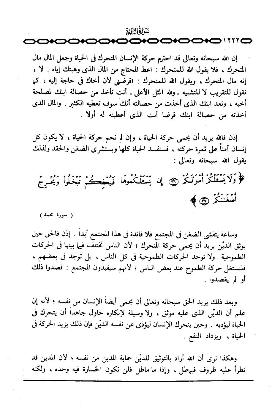 إذن فالله يريد أن يحمي حركة الحياة، وإن لم نحم حركة الحياة، لا يكون كل إنسان آمناً على ثمرة حركته، فستفسد الحياة كلها ويستشري الضغن والحقد والذي يقول الله سبحانه وتعالى: {وَلاَ يَسْأَلْكُمْ أَمْوَالَكُمْ إِن يَسْأَلْكُمُوهَا فَيُحْفِكُمْ تَبْخَلُواْ وَيُخْرِجْ أَضْغَانَكُمْ} [محمد: 36 - 37]