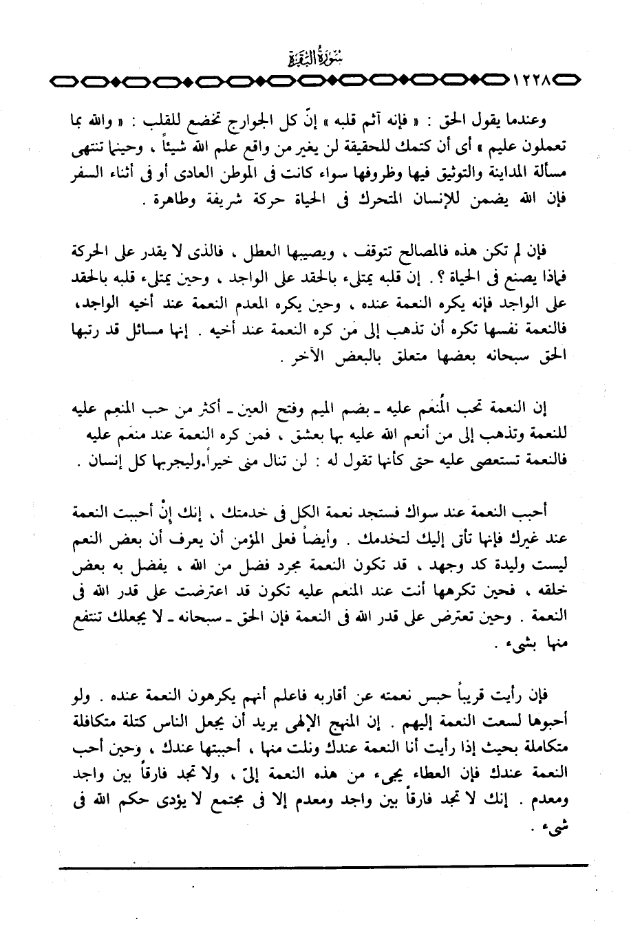 إن النعمة تحب المُنعم عليه بضم الميم وفتح العين أكثر من حب المنعم عليه للنعمة وتذهب إلى من أنعم الله عليه بها بعشق، فمن كره النعمة عند منعم عليه فالنعمة تستعصي عليه حتى كأنها تقول له: لن تنال مني خيراً. وليجربها كل إنسان.