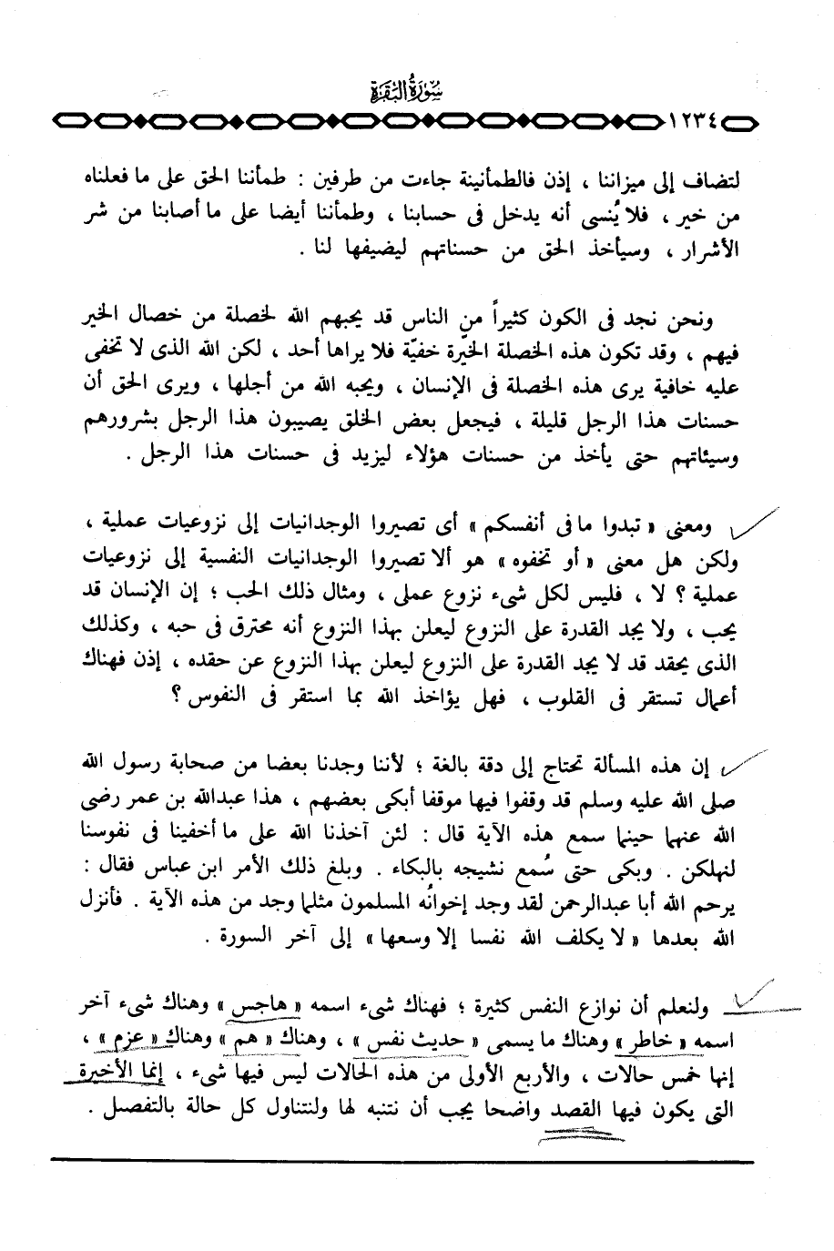إن هذه المسألة تحتاج إلى دقة بالغة؛ لأننا وجدنا بعضا من صحابة رسول الله صَلَّى اللَّهُ عَلَيْهِ وَسَلَّم َ قد وقفوا فيها موقفا أبكى بعضهم، هذا عبد الله بن عمر رَضِيَ اللَّهُ عَنْهما حينما سمع هذه الآية قال: لئن آخذنا الله على ما أخفينا في نفوسنا لنهلكن. وبكى حتى سُمع نشيجه بالبكاء. وبلغ ذلك الأمر ابن عباس فقال: يرحم الله أبا عبد الرحمن لقد وجد إخوانه المسلمون مثلما وجد من هذه الآية. فأنزل الله بعدها {لاَ يُكَلِّفُ الله نَفْساً إِلاَّ وُسْعَهَا} إلى آخر السورة. ولنعلم أن نوازع النفس كثيرة؛ فهناك شيء اسمه «هاجس» وهناك شيء آخر اسمه «خاطر» وهناك ما يسمى «حديث نفس» ، وهناك «هم» وهناك «عزم» ، إنها خمس حالات، والأربع الأولى من هذه الحالات ليس فيها شيء، إنما الأخيرة التي يكون فيها القصد واضحا يجب أن نتنبه لها ولنتناول كل حالة بالتفصيل.