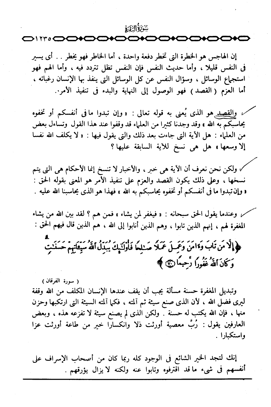 والقصد هو الذي يُعني به قوله تعالى: {وَإِن تُبْدُواْ مَا في أَنْفُسِكُمْ أَوْ تُخْفُوهُ يُحَاسِبْكُمْ بِهِ الله} وقد وجدنا كثيرا من العلماء قد وقفوا عند هذا القول وتساءل بعض من العلماء: هل الآية التي جاءت بعد ذلك والتي يقول فيها: {لاَ يُكَلِّفُ الله نَفْساً إِلاَّ وُسْعَهَا} هل هي نسخ للآية السابقة عليها؟