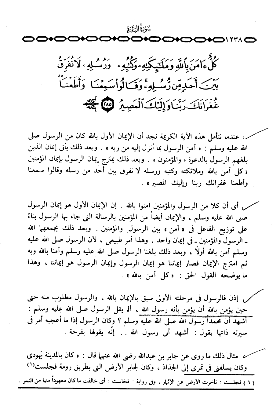 عندما نتأمل هذه الآية الكريمة نجد أن الإيمان الأول بالله كان من الرسول صَلَّى اللَّهُ عَلَيْهِ وَسَلَّم َ: {آمَنَ الرسول بِمَآ أُنْزِلَ إِلَيْهِ مِن رَّبِّهِ} . وبعد ذلك يأتي إيمان الذين بلغهم الرسول بالدعوة {والمؤمنون} . وبعد ذلك يمتزج إيمان الرسول بإيمان المؤمنين {كُلٌّ آمَنَ بالله وملائكته وَكُتُبِهِ وَرُسُلِهِ لاَ نُفَرِّقُ بَيْنَ أَحَدٍ مِّن رُّسُلِهِ وَقَالُواْ سَمِعْنَا وَأَطَعْنَا غُفْرَانَكَ رَبَّنَا وَإِلَيْكَ المصير} .