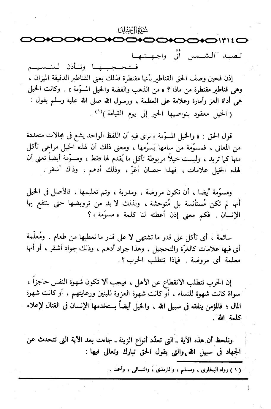 إذن فحين وصف الحق القناطير بأنها مقنطرة فذلك يعني القناطير الدقيقة الميزان، وهي قناطير مقنطرة من ماذا؟ {مِنَ الذهب والفضة والخيل المسومة} . وكانت الخيل هي أداة العز وأمارة وعلامة على العظمة، ورسول الله صَلَّى اللَّهُ عَلَيْهِ وَسَلَّم َ يقول: «الخيل معقود بنواصيها الخير إلى يوم القيامة»