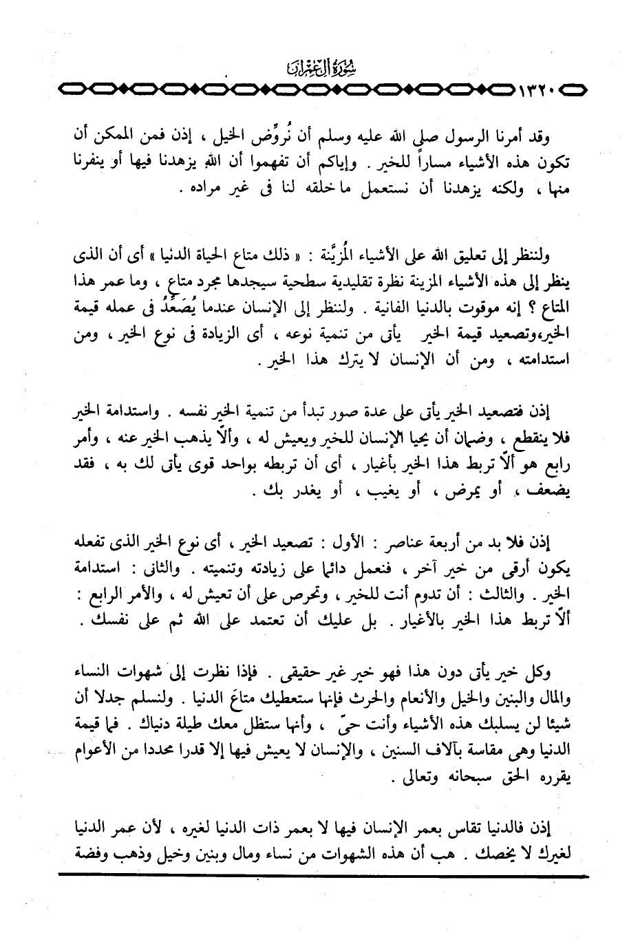 وقد أمرنا الرسول صَلَّى اللَّهُ عَلَيْهِ وَسَلَّم َ أن نُروِّض الخيل، إذن فمن الممكن أن تكون هذه الأشياء مساراً للخير. وإياكم أن تفهموا أن الله يزهدنا فيها أو ينفرنا منها، ولكنه يزهدنا أن نستعمل ما خلقه لنا في غير مراده.