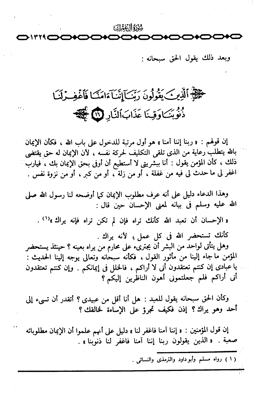 وهذا الدعاء دليل على أنه عرف مطلوب الإيمان كما أوضحه لنا رسول الله صَلَّى اللَّهُ عَلَيْهِ وَسَلَّم َ في بيانه لمعنى الإحسان حين قال: «الإحسان أن تعبد الله كأنك تراه فإن لم تكن تراه فإنه يراك» .