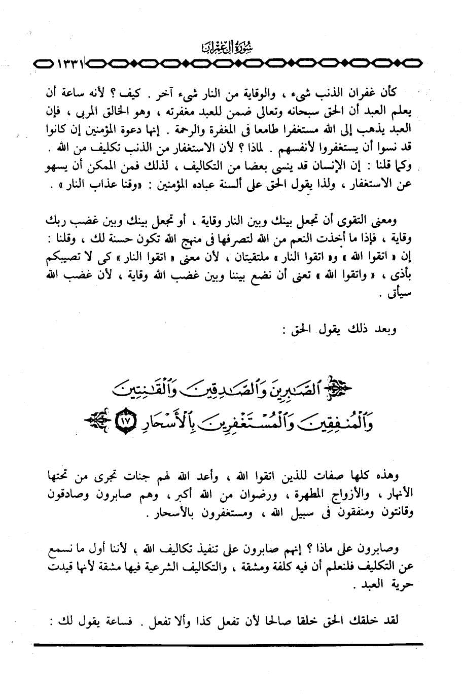 وهذه كلها صفات للذين اتقوا الله، وأعد الله لهم جنات تجري من تحتها الأنهار، والأزواج المطهرة، ورضوان من الله أكبر، وهم صابرون وصادقون وقانتون ومنفقون في سبيل الله، ومستغفرون بالأسحار.