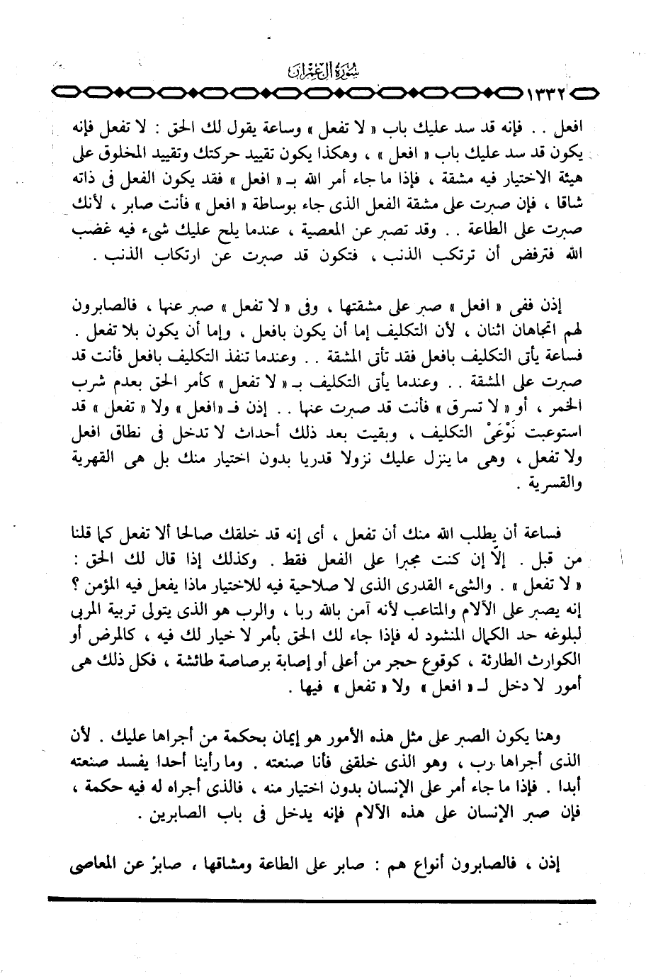 افعل. . فإنه قد سد عليك باب «لا تفعل» وساعة يقول لك الحق: لا تفعل فإنه يكون قد سد عليك باب «افعل» ، وهكذا يكون تقييد حركتك وتقييد المخلوق على هيئة الإختيار فيه مشقة، فإذا ما جاء أمر الله ب «افعل» فقد يكون الفعل في ذاته شاقا، فإن صبرت على مشقة الفعل الذي جاء بوساطة «افعل» فأنت صابر، لأنك صبرت على الطاعة. . وقد تصبر عن المعصية، عندما يلح عليك شيء فيه غضب الله فترفض أن ترتكب الذنب، فتكون قد صبرت عن ارتكاب الذنب.