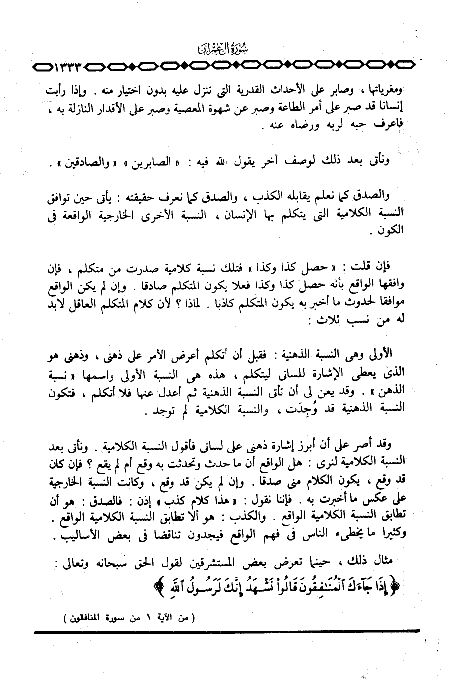 وقد أصر على أن أبرز إشارة ذهني على لساني فأقول النسبة الكلامية. ونأتي بعد النسبة الكلامية لنرى: هل الواقع أن ما حدث وتحدثت به وقع أم لم يقع؟ فإن كان قد وقع، يكون الكلام مني صدقا. وإن لن يكن قد وقع، وكانت النسبة الخارجية على عكس ما أخبرت به. فإننا نقول: «هذا كلام كذب» إذن: فالصدق: هو أن تطابق النسبة الكلامية الواقع. والكذب: هو ألا تطابق النسبة الكلامية الواقع وكثيرا ما يخطىء الناس في فهم الواقع فيجدون تناقضا في بعض الأساليب.