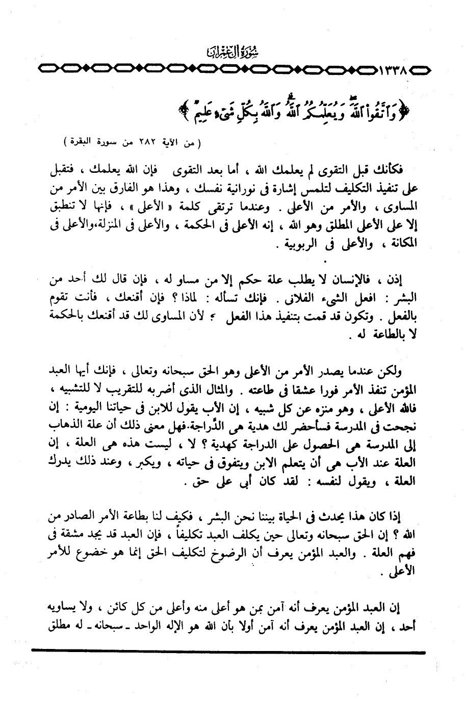 فكأنك قبل التقوى لم يعلمك الله، أما بعد التقوى فإن الله يعلمك، فتقبل على تنفيذ التكليف لتلمس إشارة في نورانية نفسك، وهذا هو الفارق بين الأمر من المساوى، والأمر من الأعلى. وعندما ترتقي كلمة «الأعلى» ، فإنها لا تنطبق إلا على الأعلى المطلق وهو الله، لأنه الأعلى في الحكمة، والأعلى في المنزلة، والأعلى في المكانة، والأعلى في الربوبية.