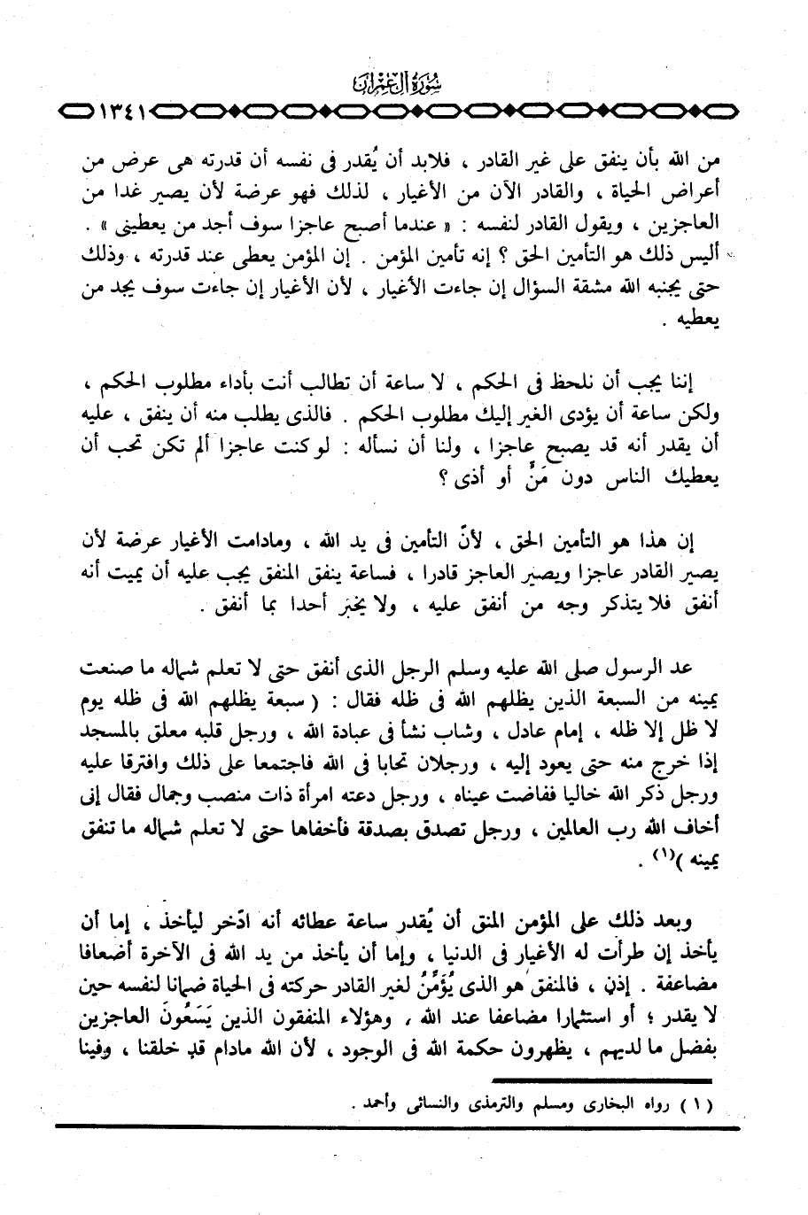 من الله بأن ينفق على غير القادر، فلابد أن يُقدر في نفسه أن قدرته هي عرض من أعراض الحياة، والقادر الآن من الأغيار، لذلك فهو عرضة لأن يصير غدا من العاجزين، ويقول القادر لنفسه: «عندما أصبح عاجزا سوف أجد من يعطيني» . أليس ذلك هو التأمين الحق؟ إنه تأمين المؤمن. إن المؤمن يعطي عند قدرته، وذلك حتى يجنبه الله مشقة السؤال إن جاءت الأغيار، لأن الأغيار إن جاءت سوف يجد من يعطيه.
