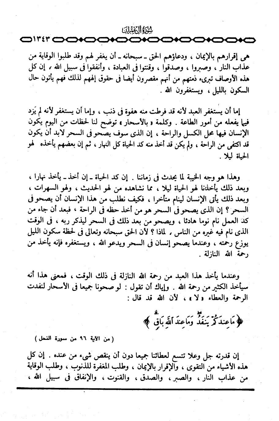 هي إقرارهم بالإيمان، ودعاؤهم الحق - سبحانه - أن يغفر لهم وقد طلبوا الوقاية من عذاب النار، وصبروا، وصدقوا، وقنتوا في العبادة، وأنفقوا في سبيل الله، إن كل هذه الأوصاف تبرئ ذمتهم من أنهم مقصرون أيضا في حقوق إلههم لذلك فهم يأتون حال السكون بالليل، ويستغفرون الله.