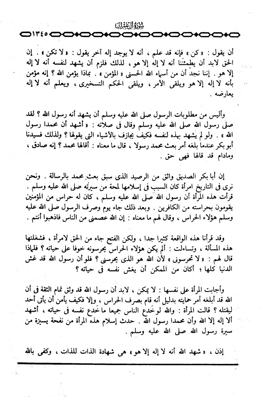 وأجابت المرأة على نفسها: لا يمكن، لا بد أن رسول الله قد وثق تمام الثقة في أن الله قد أبلغه أمر حمايته بدليل أنه قام بصرف الحراس، وإلا فكيف يأمن أن يأتي أحد ليقتله؟ قالت المرأة: والله لو خَدع الناس جميعا ما خَدع نفسه في حياته، أشهد ألا إله إلا الله وأن محمدا رسول الله.