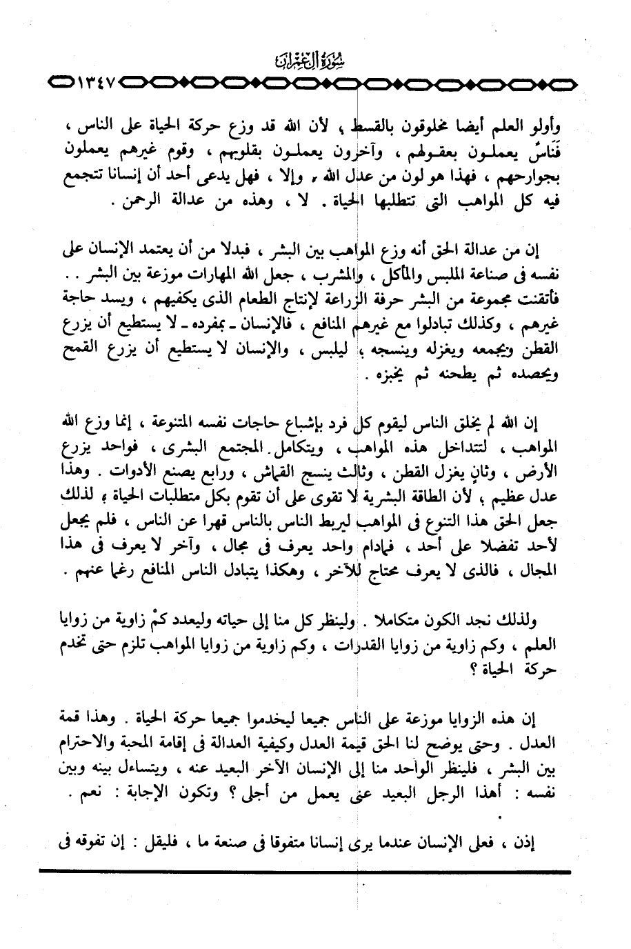 لون من عدل الله، وإلا، فهل يدعي أحد أن إنسانا تتجمع فيه كل المواهب التي تتطلبها الحياة. لا، وهذه من عدالة الرحمن.