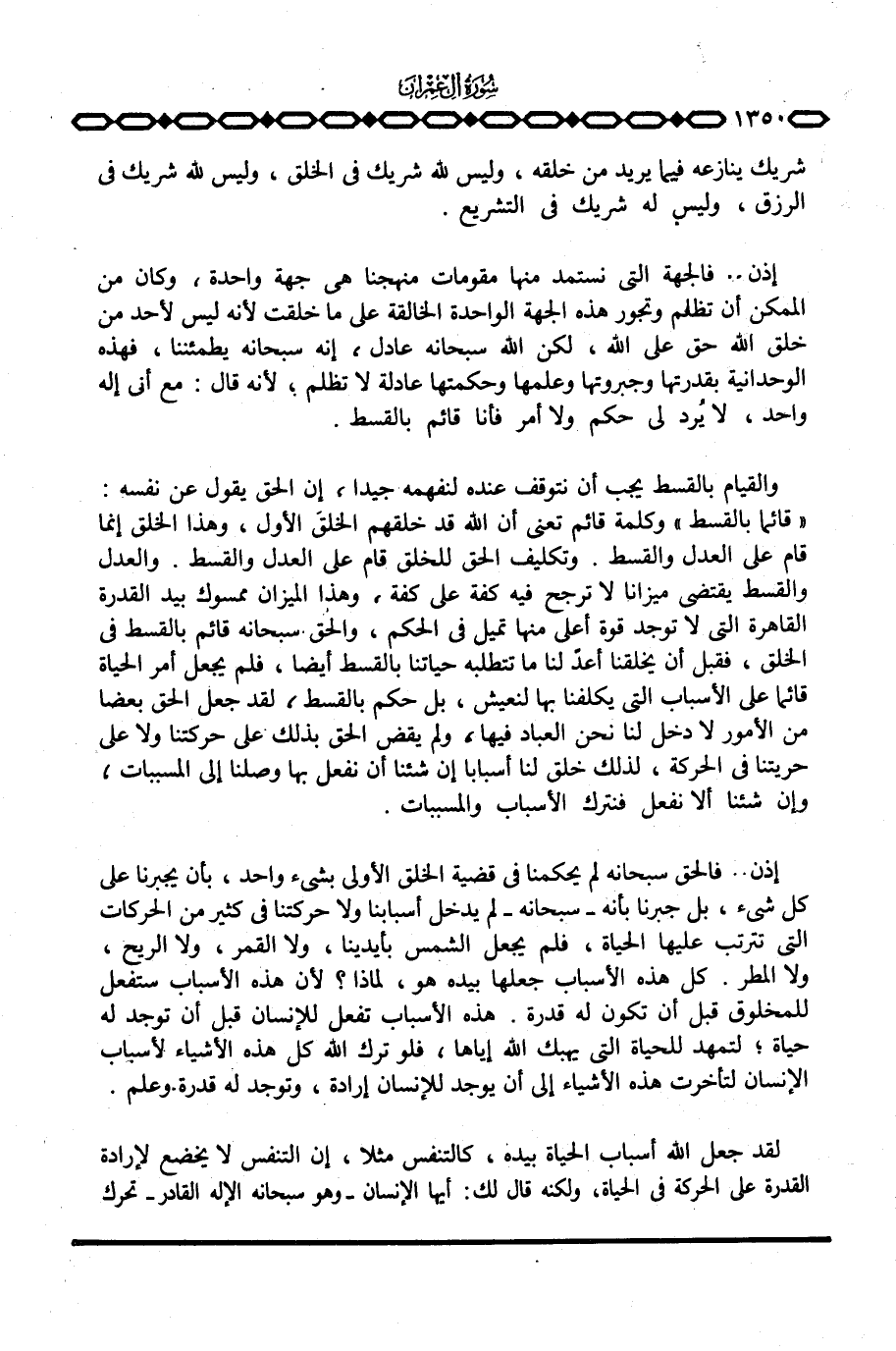 والقيام بالقسط يجب أن نتوقف عنده لنفهمه جيدا، إن الحق يقول عن نفسه: «قائما بالقسط» وكلمة قائم تعني أن الله قد خلقهم الخلق الأول، وهذا الخلق إنما قام على العدل والقسط. وتكليف الحق للخلق قام على العدل والقسط. والعدل والقسط يقتضي ميزانا لا ترجح فيه كفة على كفة، وهذا الميزان ممسوك بيد القدرة القاهرة التي لا توجد قوة أعلى منها تميل في الحكم، والحق سبحانه قائم بالقسط في الخلق، فقبل أن يخلقنا أعدّ لنا ما تتطلبه حياتنا بالقسط أيضا، فلم يجعل أمر الحياة قائما على الأسباب التي يكلفنا بها لنعيش، بل حكم بالقسط، لقد جعل الحق بعضا من الأمور لا دخل لنا نحن العباد فيها، ولم يقض الحق بذلك على حركتنا ولا على حريتنا في الحركة، لذلك خلق لنا أسبابا إن شئنا أن نفعل بها وصلنا إلى المسببات، وإن شئنا ألا نفعل فنترك الأسباب والمسببات.