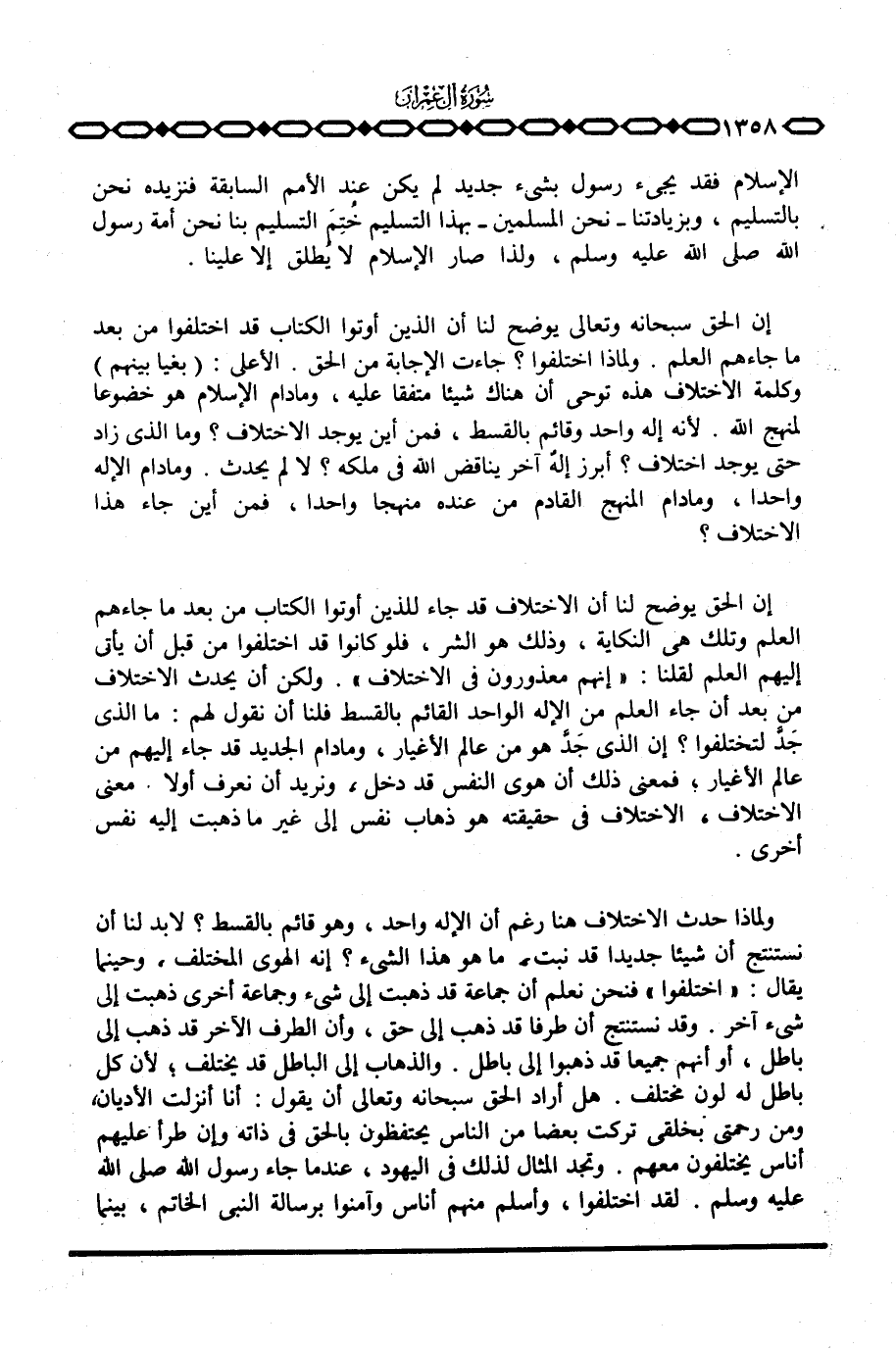 إن الحق يوضح لنا أن الاختلاف قد جاء للذين أوتوا الكتاب من بعد ما جاءهم العلم وتلك هي النكاية، وذلك هو الشر، فلو كانوا قد اختلفوا من قبل أن يأتي إليهم العلم لقلنا: «إنهم معذورون في الاختلاف» .