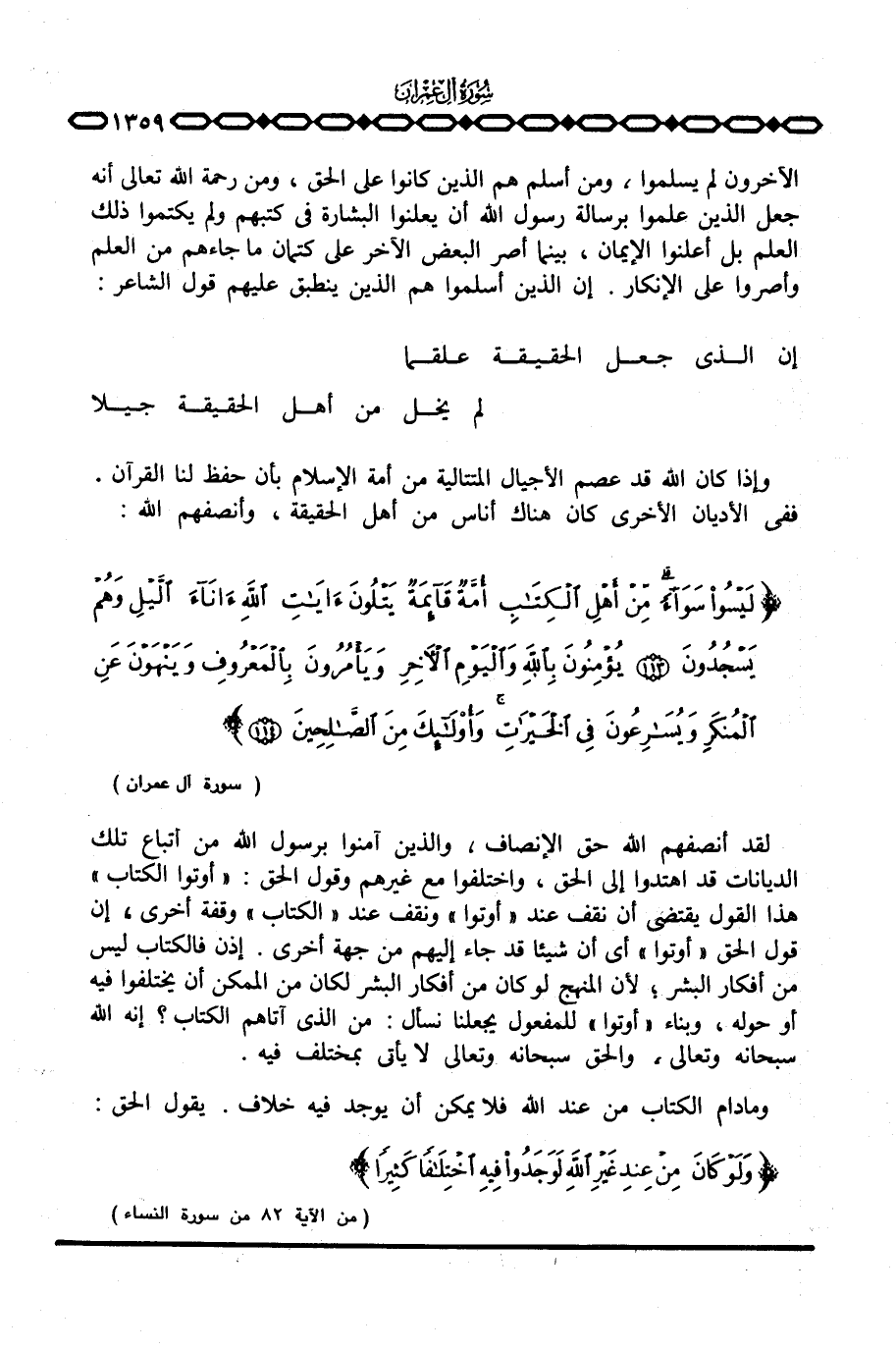 وإذا كان الله قد عصم الأجيال المتتالية من أمة الإسلام بأن حفظ لنا القرآن. ففي الأديان الأخرى كان هناك أناس من أهل الحقيقة، وأنصفهم الله: {لَيْسُواْ سَوَآءً مِّنْ أَهْلِ الكتاب أُمَّةٌ قَآئِمَةٌ يَتْلُونَ آيَاتِ الله آنَآءَ الليل وَهُمْ يَسْجُدُونَ يُؤْمِنُونَ بالله واليوم الآخر وَيَأْمُرُونَ بالمعروف وَيَنْهَوْنَ عَنِ المنكر وَيُسَارِعُونَ فِي الخيرات وأولئك مِنَ الصالحين} [آل عمران: 113 - 114] .