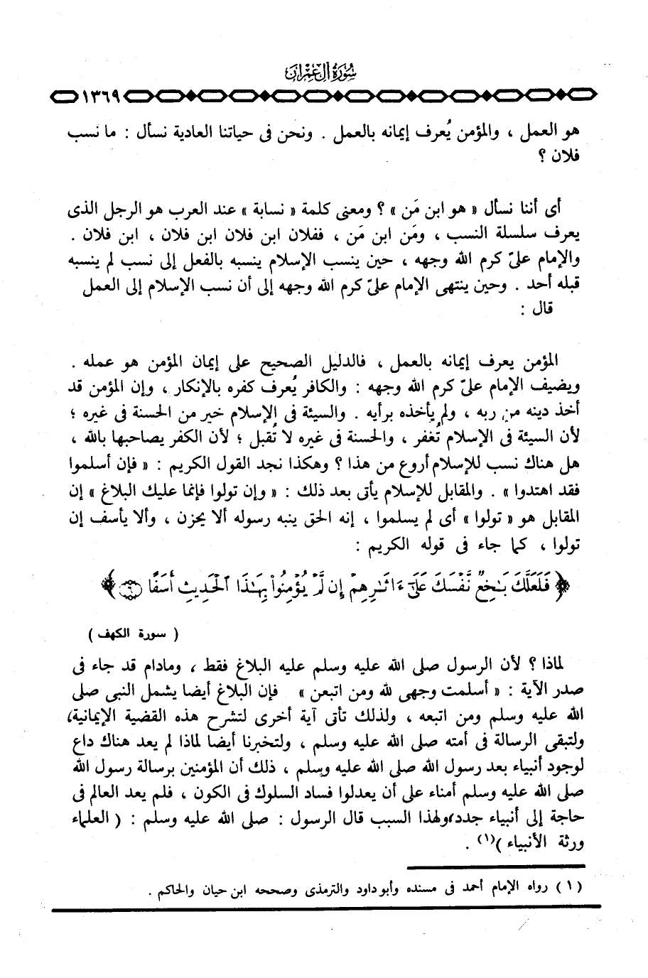 المؤمن يعرف إيمانه بالعمل، فالدليل الصحيح على إيمان المؤمن هو عمله. ويضيف الإمام عليّ كرم الله وجهه: والكافر يُعرف كفره بالإنكار، وإن المؤمن قد أخذ دينه من ربه، ولم يأخذه برأيه. والسيئة في الإسلام خير من الحسنة في غيره؛ لأن السيئة في الإسلام تغفر، والحسنة في غيره لا تُقبل؛ لأن الكفر يصاحبها بالله هل هناك نسب للإسلام أروع من هذا؟ وهكذا نجد القول الكريم: {فَإِنْ أَسْلَمُواْ فَقَدِ اهتدوا} . والمقابل للإسلام يأتي بعد ذلك: {وَّإِن تَوَلَّوْاْ فَإِنَّمَا عَلَيْكَ البلاغ} إن المقابل هو «تولوا» أي لم يسلموا، إنه الحق ينبه رسوله ألا يحزن وألا يأسف إن تولوا كما جاء في قوله الكريم: {فَلَعَلَّكَ بَاخِعٌ نَّفْسَكَ على آثَارِهِمْ إِن لَّمْ يُؤْمِنُواْ بهذا الحديث أَسَفاً} [الكهف: 6] .
