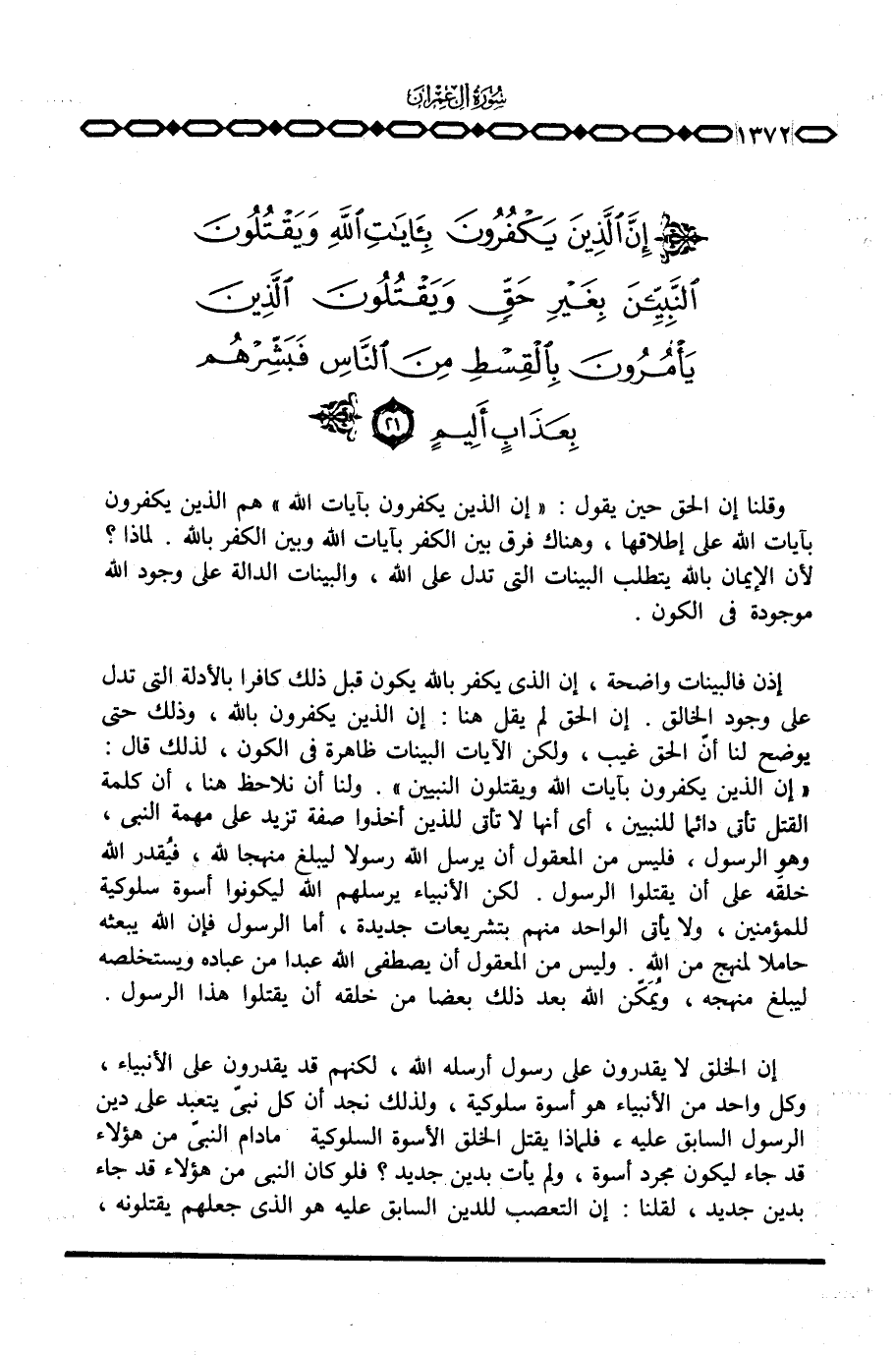 إذن فالبينات واضحة، إن الذي يكفر بالله يكون قبل ذلك كافرا بالأدلة التي تدل على وجود الخالق. إن الحق لم يقل هنا: إن الذين يكفرون بالله، وذلك حتى يوضح لنا أنّ الحق غيب، ولكن الآيات البينات ظاهرة في الكون، لذلك قال: {إِنَّ الذين يَكْفُرُونَ بِآيَاتِ الله وَيَقْتُلُونَ النبيين} . ولنا أن نلاحظ هنا، أن كلمة القتل تأتي دائما للنبيين، أي أنها لا تأتي للذين أخذوا صفة تزيد على مهمة النبي، وهو الرسول، فليس من المعقول أن يرسل الله رسولا ليبلغ منهجا لله، فيُقدر الله خلقه على أن يقتلوا الرسول. ولكن الأنبياء يرسلهم الله ليكونوا أسوة سلوكية للمؤمنين، ولا يأتي الواحد منهم بتشريعات جديدة، أما الرسول فإن الله يبعثه حاملا لمنهج من الله. وليس من المعقول أن يصطفي الله عبدا من عباده ويستخلصه ليبلغ منهجه، ويُمَكّن الله بعد ذلك بعضا من خلقه أن يقتلوا هذا الرسول.