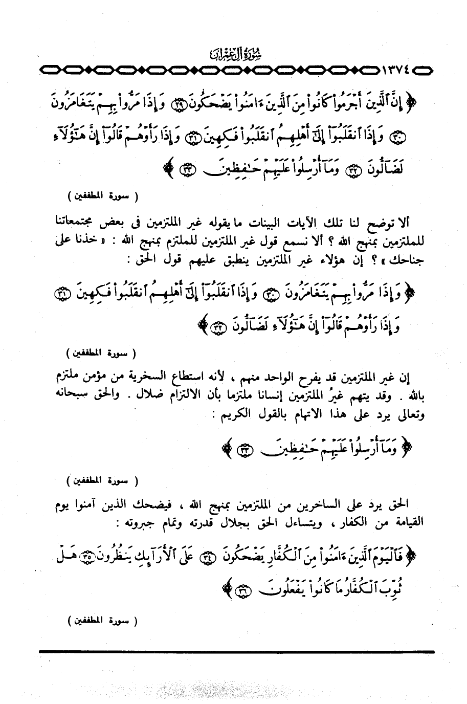 ألا توضح لنا تلك الآيات البينات ما يقوله غير الملتزمين في بعض مجتمعاتنا للملتزمين بمنهج الله؟ ألا نسمع قول غير الملتزمين للملتزم بمنهج الله: «خذنا على جناحك» ؟ إن هؤلاء غير الملتزمين ينطبق عليهم قول الحق: {وَإِذَا مَرُّواْ بِهِمْ يَتَغَامَزُونَ وَإِذَا انقلبوا إلى أَهْلِهِمُ انقلبوا فَكِهِينَ وَإِذَا رَأَوْهُمْ قالوا إِنَّ هؤلاء لَضَالُّونَ} [المطففين: 30 - 32] .