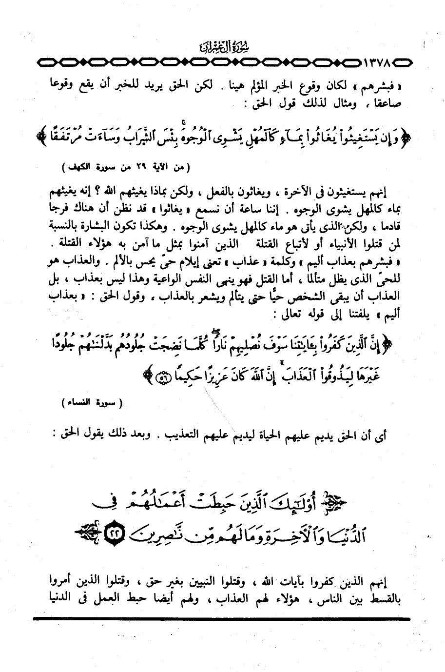 إنهم يستغيثون في الآخرة، ويغاثون بالفعل، ولكن بماذا يغيثهم الله؟ إنه يغيثهم بماء كالمهل يشوي الوجوه. إننا ساعة أن نسمع «يغاثوا» قد نظن أن هناك فرجا قادما، ولكن الذي يأتي هو ماء كالمهل يشوي الوجوه. وهكذا تكون البشارة بالنسبة لمن قتلوا الأنبياء أو لأتباع القتلة الذين آمنوا بمثل ما آمن به هؤلاء القتلة. {فَبَشِّرْهُم بِعَذَابٍ أَلِيمٍ} وكلمة «عذاب» تعني إيلام حيّ يحس بالألم. والعذاب هو للحيّ الذي يظل متألما، أما القتل فهو ينهي النفس الواعية وهذا ليس بعذاب، بل العذاب أن يبقى الشخص حيَّا حتى يتألم ويشعر بالعذاب، وقول الحق: {بِعَذَابٍ أَلِيمٍ} يلفتنا إلى قوله تعالى: {إِنَّ الذين كَفَرُواْ بِآيَاتِنَا سَوْفَ نُصْلِيهِمْ نَاراً كُلَّمَا نَضِجَتْ جُلُودُهُمْ بَدَّلْنَاهُمْ جُلُوداً غَيْرَهَا لِيَذُوقُواْ العذاب إِنَّ الله كَانَ عَزِيزاً حَكِيماً} [النساء: 56] .