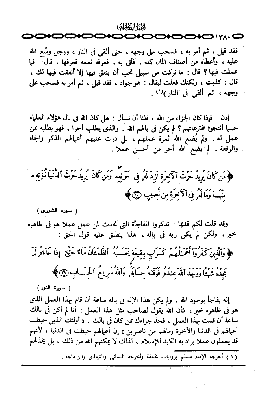 فقد قيل، ثم أمر به، فسحب على وجهه، حتى ألقي في النار، ورجل وسّع الله عليه، وأعطاه من أصناف المال كله، فأتى به، فعرفه نعمه فعرفها، قال: فما عملت فيها؟ قال: ما تركت من سبيل تحب أن ينفق فيها إلا أنفقت فيها لك، قال: كذبت، ولكنك فعلت ليقال: هو جواد، فقد قيل، ثم أمر به فسحب على وجهه، ثم ألقي في النار» .