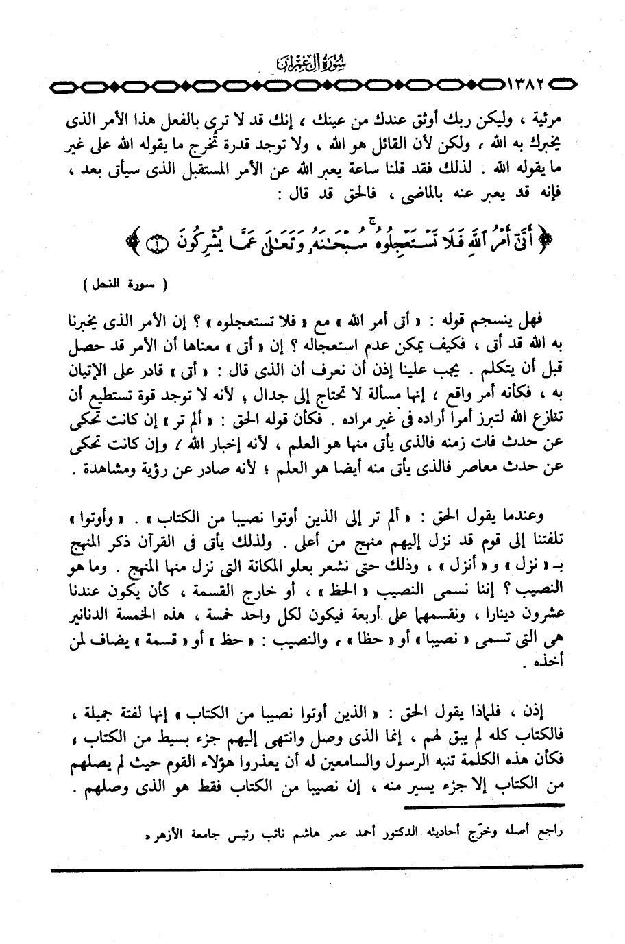 فهل ينسجم قوله: {أتى أَمْرُ الله} مع {فَلاَ تَسْتَعْجِلُوهُ} ؟ إن الأمر الذي يخبرنا به الله قد أتى، فكيف يمكن عدم استعجاله؟ إن «أتى» معناها أن الأمر قد حصل قبل أن يتكلم. يجب علينا إذن أن نعرف أن الذي قال: «أتى» قادر على الإتيان به، فكأنه أمر واقع، إنها مسألة لا تحتاج إلى جدال؛ لأنه لا توجد قوة تستطيع أن نتازع الله لتبرز أمرا أراده في غير مراده. فكأن قوله الحق: {أَلَمْ تَرَ} إن كانت تحكى عن حدث فات زمنه فالذي يأتي منها هو العلم، لأنه إخبار الله، وإن كانت تحكى عن حدث معاصر فالذي يأتي منه أيضا هو العلم؛ لأنه صادر عن رؤية ومشاهدة.