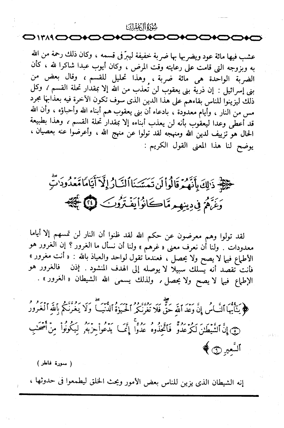 لقد تولوا وهم معرضون عن حكم الله لقد ظنوا أن النار لن تمسهم إلا أياما معدودات. ولنا أن نعرف معنى «غرهم» ولنا أن نسأل ما الغرور؟ إن الغرور هو الأطماع فيما لا يصح ولا يحصل، فعندما تقول لواحد والعياذ بالله: «أنت مغرور» فأنت تقصد أنه يسلك سبيلا لا يوصله إلى الهدف المنشود. إذن فالغرور هو الإطماع فيما لا يصح ولا يحصل، ولذلك يسمى الله الشيطان «الغرور» . {ياأيها الناس إِنَّ وَعْدَ الله حَقٌّ فَلاَ تَغُرَّنَّكُمُ الحياة الدنيا وَلاَ يَغُرَّنَّكُمْ بالله الغرور إِنَّ الشيطان لَكُمْ عَدُوٌّ فاتخذوه عَدُوّاً إِنَّمَا يَدْعُواْ حِزْبَهُ لِيَكُونُواْ مِنْ أَصْحَابِ السعير} [فاطر: 5 - 6] .