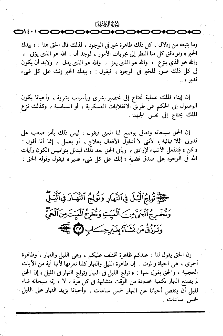 إن الحق سبحانه وتعالى يوضح لنا المعنى فيقول: ليس ذلك بأمر صعب على قدرتي اللانهائية، لأنني لا أتناول الأفعال بعلاج، أو بعمل، إنما أنا أقول: «كن» فتنفعل الأشياء لإرادتي، ويأتي الحق بعد ذلك ليدلل بنواميس الكون وآيات الله في الوجود على صدق قضية {إِنَّكَ على كُلِّ شَيْءٍ قَدِيرٌ} فيقول وقوله الحق: {تُولِجُ الليل فِي النهار وَتُولِجُ النهار فِي الليل ... }