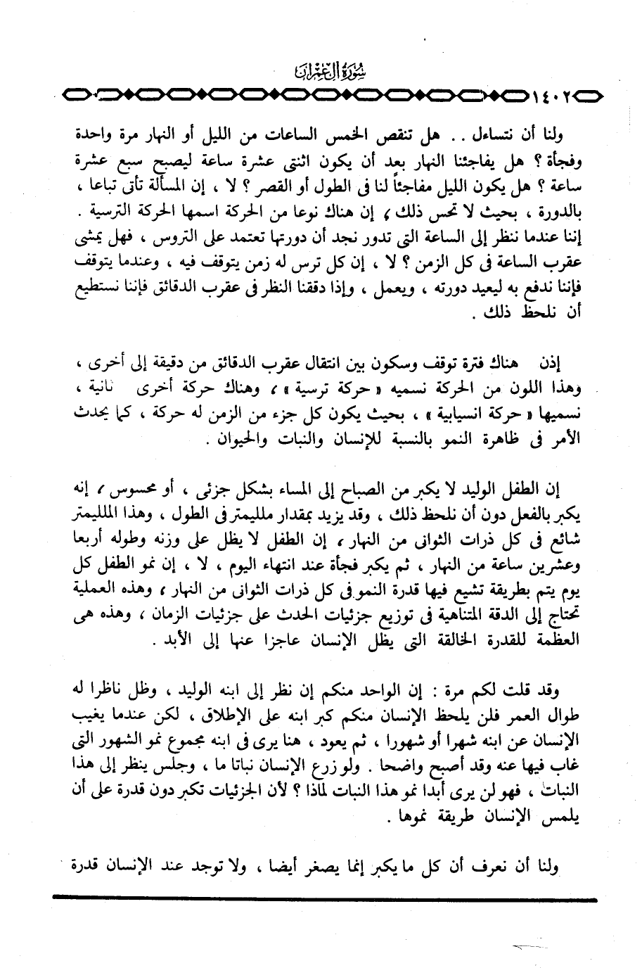 إن الطفل الوليد لا يكبر من الصباح إلى المساء بشكل جزئي، أو محسوس، إنه يكبر بالفعل دون أن نلحظ ذلك، وقد يزيد بمقدار ملليمتر في الطول، وهذا الملليمتر شائع في كل ذرات الثواني من النهار، إن الطفل لا يظل على وزنه وطوله أربعا وعشرين ساعة من النهار، ثم يكبر فجأة عند انتهاء اليوم، لا، إن نمو الطفل كل يوم يتم بطريقة تشيع فيها قدرة النمو في كل ذرات الثواني من النهار، وهذه العملية تحتاج إلى الدقة المتناهية في توزيع جزيئات الحدث على جزيئات الزمان، وهذه هي العظمة للقدرة الخالقة التي يظل الإنسان عاجزا عنها إلى الأبد.