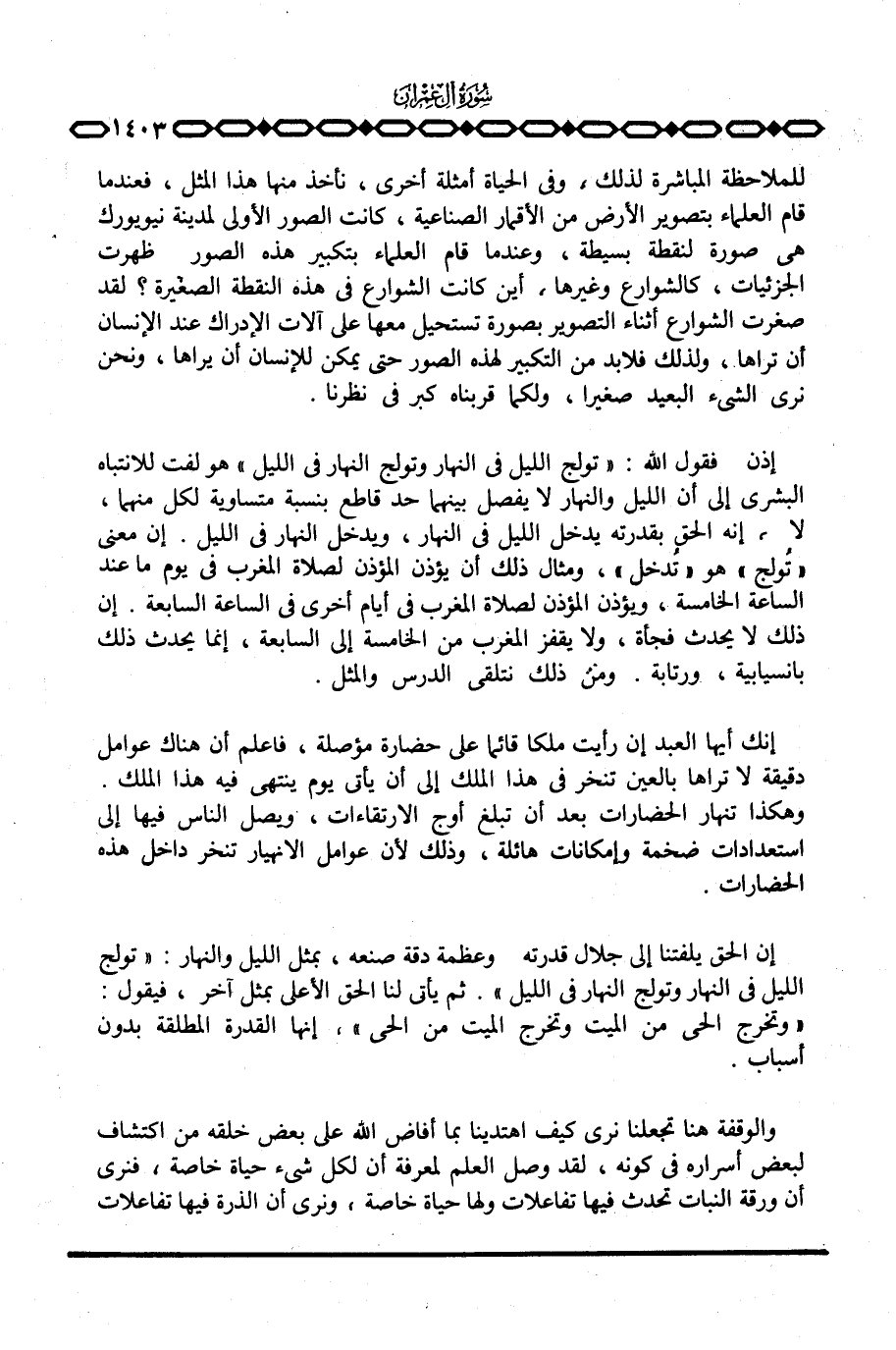 والوقفة هنا تجعلنا نرى كيف اهتدينا بما أفاض الله على بعض خلقه من اكتشاف لبعض أسراره في كونه، لقد وصل العلم لمعرفة أن لكل شيء حياة خاصة، فنرى أن ورقة النبات تحدث فيها تفاعلات ولها حياة خاصة، ونرى أن الذرة فيها تفاعلات