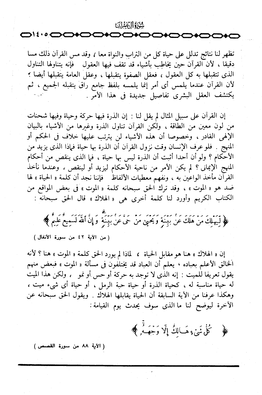 إن القرآن على سبيل المثال لم يقل لنا: إن الذرة فيها حركة وحياة وفيها شحنات من لون معين من الطاقة، ولكن القرآن تناول الذرة وغيرها من الأشياء بالبيان الإلهي القادر، وخصوصا أن هذه الأشياء لم يترتب عليها خلاف في الحكم أو المنهج. فلو عرف الإنسان وقت نزول القرآن أن الذرة بها حياة فماذا الذي يزيد من الأحكام؟ ولو أن أحدا أثبت أن الذرة ليس بها حياة فما الذي ينقص من أحكام المنهج الإيماني؟ لم يكن الأمر من ناحية الأحكام ليزيد أو لينقص، وعندما نأخذ القرآن مأخذ الواعين به، ونفهم معطيات الألفاظ فإننا نجد أن كلمة «الحياة» لها ضد هو «الموت» ، وقد ترك الحق سبحانه كلمة «الموت» في بعض المواقع من الكتاب الكريم وأورد لنا كلمة أخرى هي «الهلاك» قال الحق سبحانه: