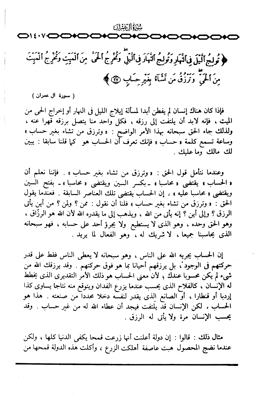 إن الحساب يجريه الله على الناس، وهو سبحانه لا يعطي الناس فقط على قدر حركتهم في الوجود، بل يرزقهم أحيانا بما هو فوق حركتهم. وقد يرزقك الله من شيء لم يكن محسوبا عندك؛ لأن معنى الحساب هو ذلك الأمر التقديري الذي يخطط له الإنسان، كالفلاح الذي يحسب عندما يزرع الفدان ويتوقع منه نتاجا يساوي كذا إردبا أو قنطارا، أو الصانع الذي يقدر لنفسه دخلا محددا من صنعته. هذا هو الحساب، لكن الإنسان قد يلتفت فيجد أن عطاء الله له من غير حساب. وقد يحسب الإنسان مرة ولا يأتي له الرزق.