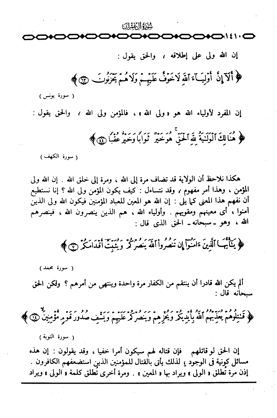 هكذا نلاحظ أن الولاية قد تضاف مرة إلى الله، ومرة إلى خلق الله. إن الله ولي المؤمن، وهذا أمر مفهوم، وقد نتساءل: كيف يكون المؤمن ولي الله؟ إنا نستطيع أن نفهم هذا المعنى كما يلي: إن الله هو المعين للعباد المؤمنين فيكون الله ولي الذين آمنوا، أي معينهم ومقويهم. وأولياء الله، هم الذين ينصرون الله، فينصرهم الله، وهو - سبحانه - الحق الذي قال: {ياأيها الذين آمنوا إِن تَنصُرُواْ الله يَنصُرْكُمْ وَيُثَبِّتْ أَقْدَامَكُمْ} [محمد: 7] .