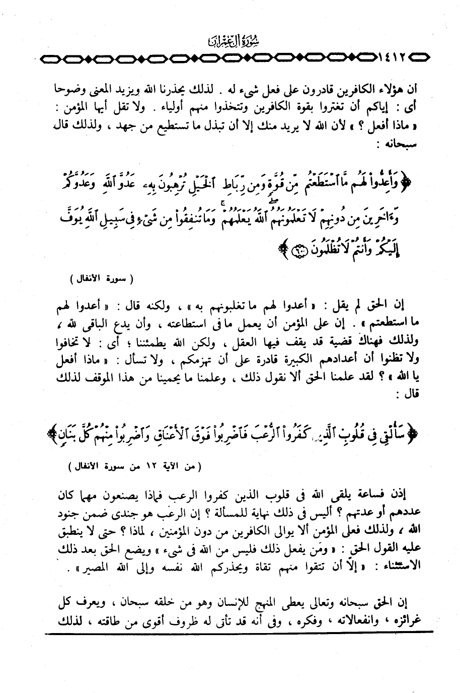 إن هؤلاء الكافرين قادرون على فعل شيء له. لذلك يحذرنا الله ويزيد المعنى وضوحا أي: إياكم أن تغتروا بقوة الكافرين وتتخذوا منهم أولياء. ولا تقل أيها المؤمن: «ماذا أفعل؟» لأن الله لا يريد منك إلا أن تبذل ما تستطيع من جهد، ولذلك قال سبحانه: {وَأَعِدُّواْ لَهُمْ مَّا استطعتم مِّن قُوَّةٍ وَمِن رِّبَاطِ الخيل تُرْهِبُونَ بِهِ عَدْوَّ الله وَعَدُوَّكُمْ وَآخَرِينَ مِن دُونِهِمْ لاَ تَعْلَمُونَهُمُ الله يَعْلَمُهُمْ وَمَا تُنفِقُواْ مِن شَيْءٍ فِي سَبِيلِ الله يُوَفَّ إِلَيْكُمْ وَأَنْتُمْ لاَ تُظْلَمُونَ} [الأنفال: 60] .