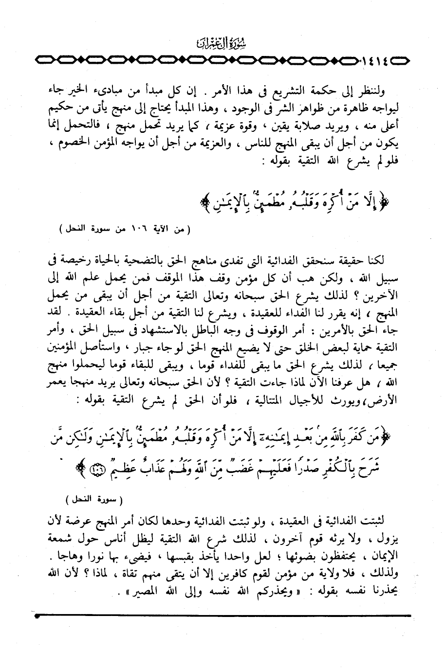 لثبتت الفدائية في العقيدة، ولو ثبتت الفدائية وحدها لكان أمر المنهج عرضه لأن يزول، ولا يرثه قوم آخرون، لذلك شرع الله التقية ليظل أناس حول شمعة الإيمان، يحتفظون بضوئها؛ لعل واحدا يأخذ بقبسها، فيضيء بها نورا وهاجا. ولذلك، فلا ولاية من مؤمن لقوم كافرين إلا أن يتقى منهم تقاة، لماذا؟ لأن الله يحذرنا نفسه بقوله: {وَيُحَذِّرُكُمُ الله نَفْسَهُ وإلى الله المصير} .