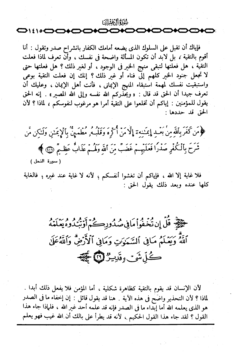 لأن الإنسان قد يقوم بالتقية كظاهرة شكلية، أما المؤمن فلا يفعل ذلك أبدا. لماذا؟ لأن التحذير واضح في هذه الآية. هنا قد يقول قائل: إن إخفاء ما في الصدر هو الذي يعلمه الله أما إبداء ما في الصدر فإنه قد علمه أحد غير الله، فلماذا جاء هذا القول؟ لقد جاء هذا القول الحكيم، لأنه قد يطرأ على بالك أن الله غيب فهو يعلم