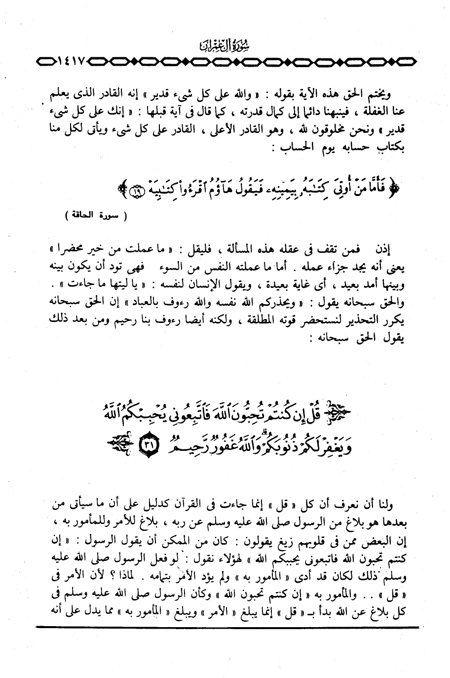 إذن فمن تقف في عقله هذه المسألة، فليقل: {مَّا عَمِلَتْ مِنْ خَيْرٍ مُّحْضَراً} يعني أنه يجد جزاء عمله. أما ما عملته النفس من السوء فهي تود أن يكون بينه وبينها أمد بعيد، أي غاية بعيدة، ويقول الإنسان لنفسه: «يا ليتها ما جاءت» . والحق سبحانه يقول: {وَيُحَذِّرُكُمُ الله نَفْسَهُ والله رَؤُوفٌ بالعباد} إن الحق سبحانه يكرر التحذير لنستحضر قوته المطلقة، ولكنه أيضا رءوف بنا رحيم ومن بعد ذلك يقول الحق سبحانه: {قُلْ إِن كُنتُمْ تُحِبُّونَ الله فاتبعوني يُحْبِبْكُمُ الله ... }