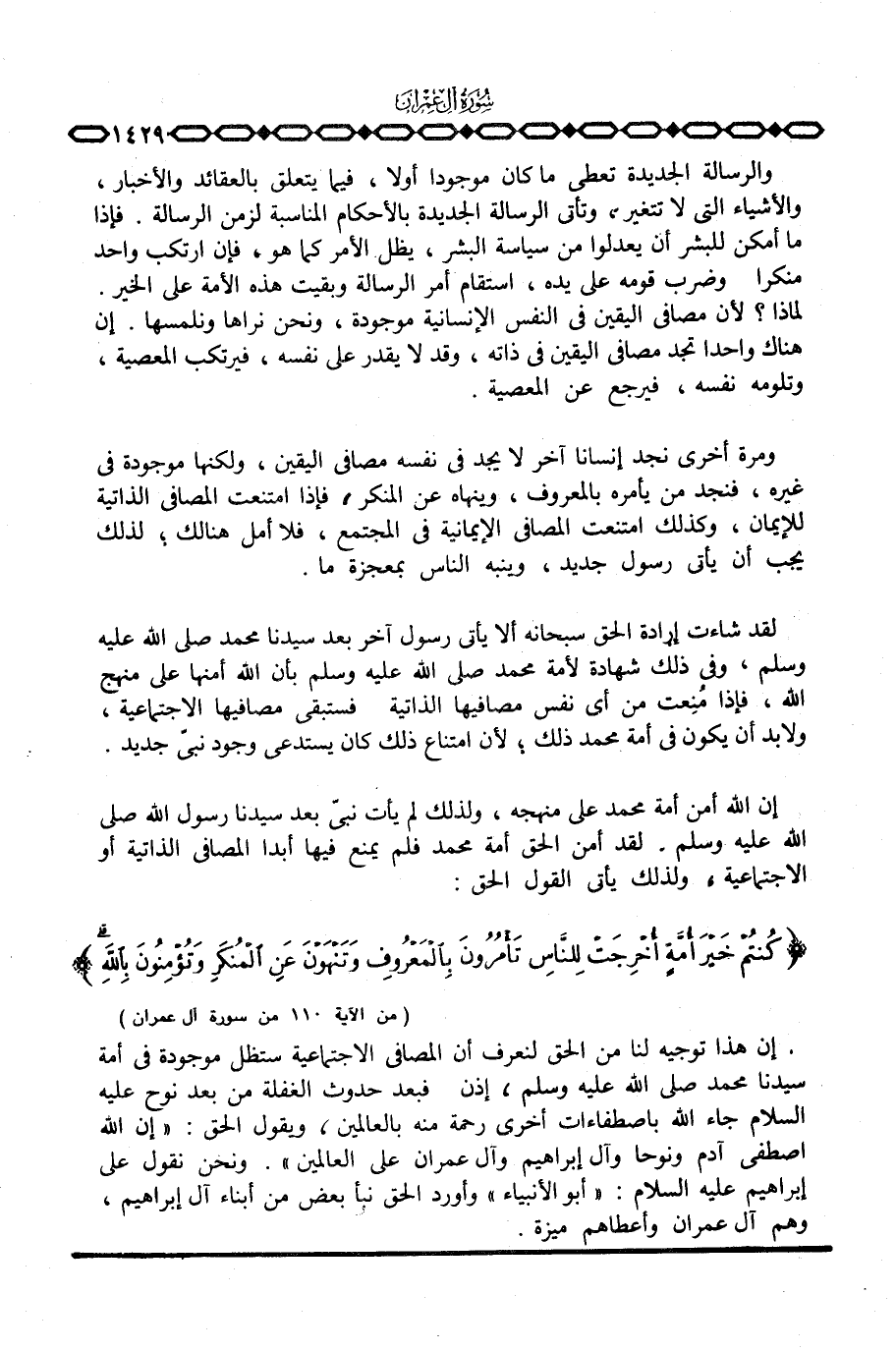 والرسالة الجديدة تعطي ما كان موجودا أولا، فيما يتعلق بالعقائد والأخبار، والأشياء التي لا تتغير، وتأتي الرسالة الجديدة بالأحكام المناسبة لزمن الرسالة. فإذا ما أمكن للبشر أن يعدلوا من سياسة البشر، يظل الأمر كما هو، فإن ارتكب واحد منكرا وضرب قومه على يده، استقام أمر الرسالة وبقيت هذه الأمة على الخير. لماذا؟ لأن مصافى اليقين في النفس الإنسانية موجودة، ونحن نراها ونلمسها. إن هناك واحدا تجد مصافي اليقين في ذاته، وقد لا يقدر على نفسه، فيرتكب المعصية، وتلومه نفسه، فيرجع عن المعصية.