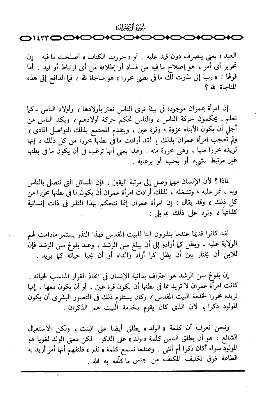 لماذا؟ لأن الإنسان مهما وصل إلى مرتبة اليقين، فإن المسائل التي تتصل بالناس وبه، تمر عليه، وتشغله، لذلك أرادت امرأة عمران أن يكون ما في بطنها محررا من كل ذلك، وقد يقال: إن امرأة عمران إنما تتحكم بهذا النذر في ذات إنسانية كذاتها، ونرد على ذلك بما يلي: