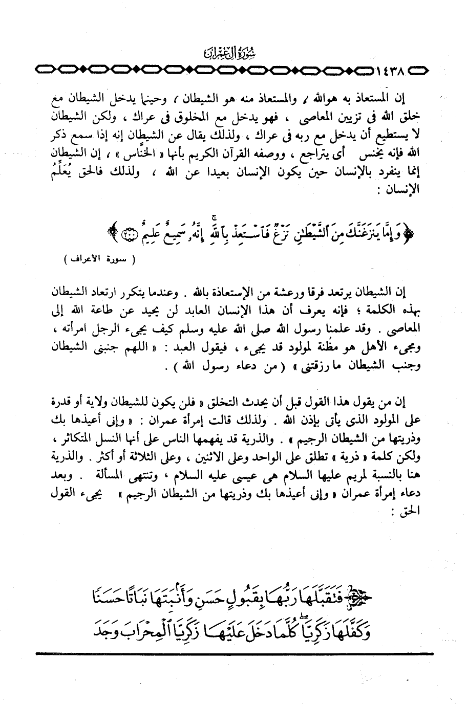 إن من يقول هذا القول قبل أن يحدث التخلق «فلن يكون للشيطان ولاية أو قدرة على المولود الذي يأتي بإذن الله. ولذلك قالت إمرأة عمران: {وِإِنِّي أُعِيذُهَا بِكَ وَذُرِّيَّتَهَا مِنَ الشيطان الرجيم} . والذرية قد يفهمها الناس على أنها النسل المتكاثر، ولكن كلمة» ذرية «تطلق على الواحد وعلى الاثنين، وعلى الثلاثة أو أكثر. والذرية هنا بالنسبة لمريم عليها السلام هي عيسى عليه السلام، وتنتهي المسألة. وبعد دعاء إمرأة عمران {وِإِنِّي أُعِيذُهَا بِكَ وَذُرِّيَّتَهَا مِنَ الشيطان الرجيم} يجيء القول الحق: {فَتَقَبَّلَهَا رَبُّهَا بِقَبُولٍ حَسَنٍ وَأَنبَتَهَا نَبَاتاً حَسَناً وَكَفَّلَهَا زَكَرِيَّا ... }