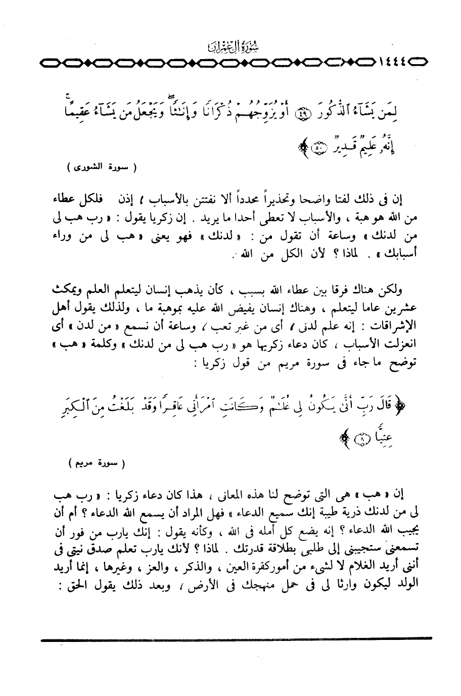 ولكن هناك فرقا بين عطاء الله بسبب، كأن يذهب إنسان ليتعلم العلم ويمكث عشرين عاما ليتعلم، وهناك إنسان يفيض الله عليه بموهبة ما، ولذلك يقول أهل الإشراقات: إنه علم لدنى، أي من غير تعب، وساعة أن نسمع «من لدن» أي انعزلت الأسباب، كان دعاء زكريا هو {رَبِّ هَبْ لِي مِن لَّدُنْكَ} وكلمة «هب» توضح ما جاء في سورة مريم من قول زكريا: {قَالَ رَبِّ أنى يَكُونُ لِي غُلاَمٌ وَكَانَتِ امرأتي عَاقِراً وَقَدْ بَلَغْتُ مِنَ الكبر عِتِيّاً} [مريم: 8] .