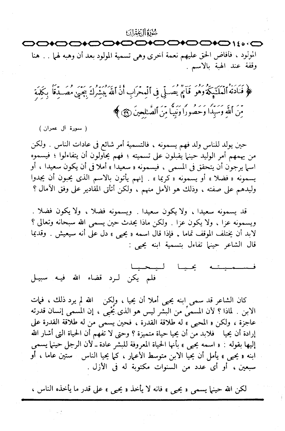 كان الشاعر قد سمى ابنه يحيى أملا أن يحيا، ولكن الله لم يرد ذلك، فمات الابن. لماذا؟ لأن المسمىِّ من البشر ليس هو الذي يُحْيِي، إن المسمى إنسان قدرته عاجزة، ولكن «المحيى» له طلاقة القدرة، فحين يسمى من له طلاقة القدرة على إرادة أن يحيا فلا بد من أن يحيا حياة متميزة؟ وحتى لا تفهم أن الحياة التي أشار الله إليها بقوله: «اسمه يحيى» بأنها الحياة المعروفة للبشر عادة - لأن الرجل حينما يسمى ابنه «يحيى» يأمل أن يحيا الابن متوسط الأعمار، كما يحيا الناس ستين عاما، أو سبعين، أو أي عدد من السنوات مكتوبة له في الأزل.