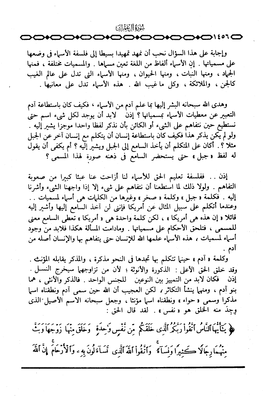 إذن. . ففلسفة تعليم الحق للأسماء لنا أزاحت عنا عبئا كبيرا من صعوبة التفاهم. ولولا ذلك لما استطعنا أن نتفاهم على شيء إلا إذا واجهنا الشيء وأشرنا إليه. فكلمة «جبل» وكلمة «صخر» وغيرها من الكلمات هي أسماء لمسميات. . وعندما أتكلم على سبيل المثال عن أمريكا فإنني لن آخذ السامع إليها وأشير إليه قائلا «إن هذه هي أمريكا» ، لكن كلمة واحدة هي «أمريكا» تعطي السامع معنى للمسمى، فتلحق الأحكام على مسمياتها. وما دامت المسألة هكذا فلا بد من وجود أسماء لمسميات، هذه الأسماء علمها الله للإنسان حتى يتفاهم بها والإنسان أصله من آدم.