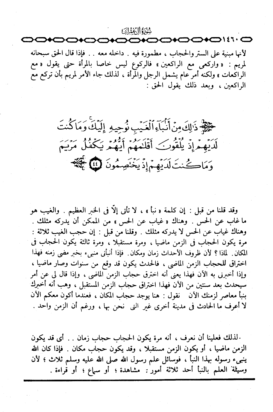 لأنها مبنية على الستر والحجاب، مطمورة فيه. داخله معه. . فإذا قال الحق سبحانه لمريم: {واركعي مَعَ الراكعين} فالركوع ليس خاصا بالمرأة حتى يقول «مع الراكعات» ولكنه أمر عام يشمل الرجل والمرأة، لذلك جاء الأمر لمريم بأن تركع مع الراكعين، وبعد ذلك يقول الحق: {ذلك مِنْ أَنَبَآءِ الغيب نُوحِيهِ إِلَيكَ ... }