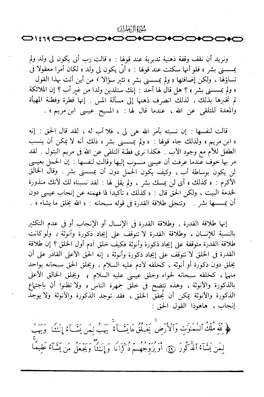 إنها طلاقة القدرة، وطلاقة القدرة في الإنسال أو الإنجاب أو في عدم التكثير بالنسبة للإنسان وطلاقة القدرة لا تتوقف على إيجاد ذكورة وأنوثة، ولو كانت طلاقة القدرة في الخلق لا تتوقف على إيجاد ذكورة وأنوثة، إنه الحق الأعلى القادر على أن يخلق دون ذكورة أو أنوثة، كخلقه لآدم عليه السلام، ويخلق الحق سبحانه بواحد منهما، كخلقه سبحانه لحواء وخلق عيسى عليه السلام، ويخلق الخالق الأعلى الذكورة والأنوثة يمكن أن يُحقق الخلق، فقد توجد الذكورة والأنوثة ولا يوجد إنجاب، ها هو ذا القول الحق: {لِلَّهِ مُلْكُ السماوات والأرض يَخْلُقُ مَا يَشَآءُ يَهَبُ لِمَن يَشَآءُ إِنَاثاً وَيَهَبُ لِمَن يَشَآءُ الذكور أَوْ يُزَوِّجُهُمْ ذُكْرَاناً وَإِنَاثاً وَيَجْعَلُ مَن يَشَآءُ عَقِيماً