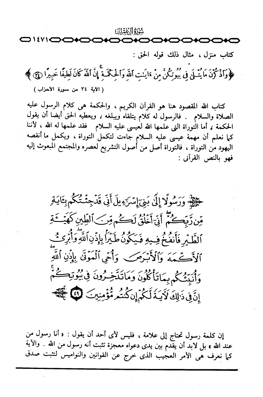 كتاب منزل، مثال ذلك قوله الحق: {واذكرن مَا يتلى فِي بُيُوتِكُنَّ مِنْ آيَاتِ الله والحكمة إِنَّ الله كَانَ لَطِيفاً خَبِيراً} [الأحزاب: 34] .